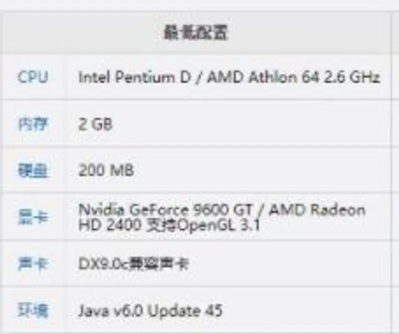 我的世界的最低配置如下图。我的世界是一款非常火的像素生存类游戏其配置要求非常的低一般家用电脑都是可以流畅运行的。