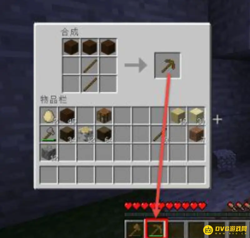 1、首先使用木板制作木镐,采集一些圆石制作石镐。