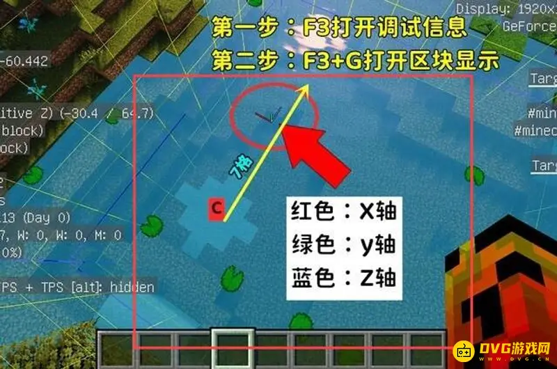 通过粘土两步即可找到钻石位置。找到粘土块之后,第一步先按F3打开调试信息界面,此时你的准星会变成坐标轴,红色为X轴正方向,绿色为Y轴,蓝色为Z轴,而正方向你只需要找到Z轴所在的方向即可。F3 G打开区块显示,然后以黏土块的中心点向Z轴正方向数7格的距离,垂直向下挖便能找到钻石矿。
