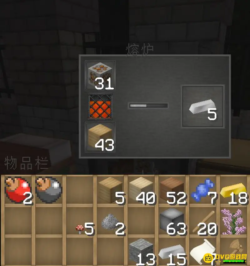 4、然后我们把精铁矿石和木板或者煤块一起放进炉子里,就能把精铁矿石烧成铁锭。