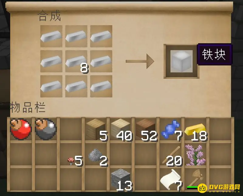 5、然后我们用九个精铁锭放满整个工作台可以合成出来一个铁块。