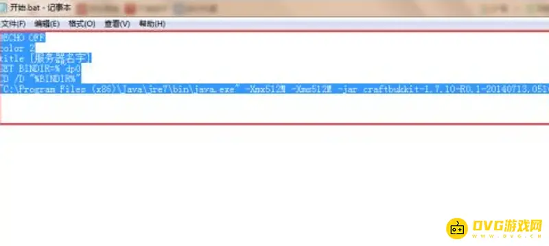 4.然后,你需要写入一段代码,如下:@ECHO OFF color 2 title [服务器名字] SET BINDIR=%~dp0 CD /D "%BINDIR%" "C:Program Files (x86)Javajre7injava.exe" -Xmx512M -Xms512M -jar craftbukkit-1.7.10-R0.1-20140713.051447-4.jar -nojline ,其中,"C:"...是Java路径,按照默认值,我写的是c盘中的,-Xmx512M是分配的内存,这只是最低值。craftbukkit...是开服包的名称 .jar,这几个根据实际更改。