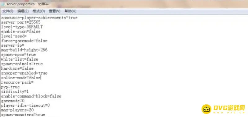 13.记事本打开后,将部分代码修改成如下:(全部不含引号)“server-ip=”--->“server-ip=127.0.0.1”(内网ip,调试阶段用这个) “online-mode=true”--->“online-mode=false”(必须改,否则非正版用户不能进入)。