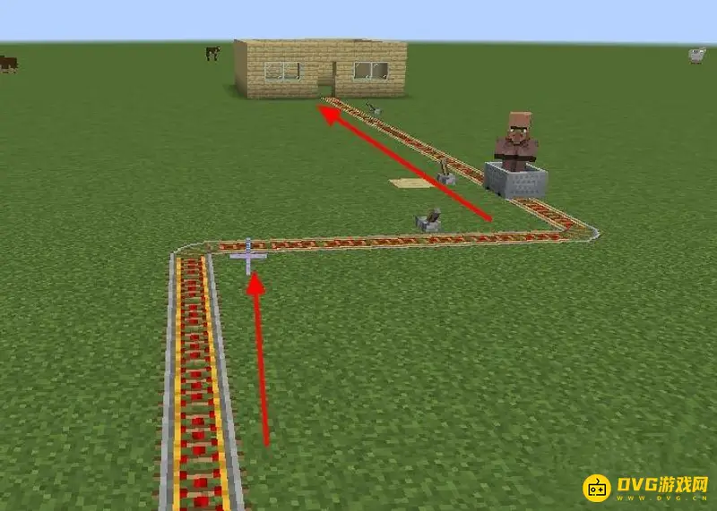 10、用动力铁轨铺下来,村民脚下的换成普通铁轨。