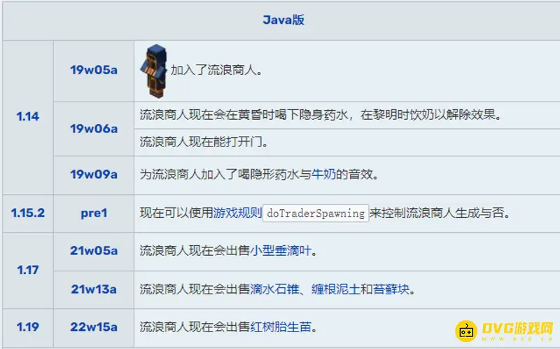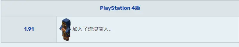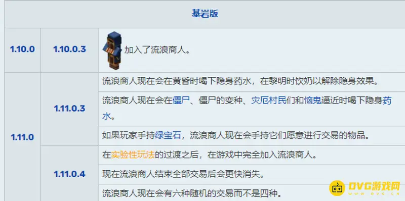 基岩版1.10.0.3加入了流浪商人。流浪商人会在黄昏时喝下隐身药水,在黎明时饮奶以解除隐身效果。