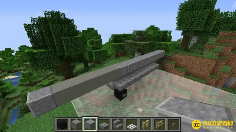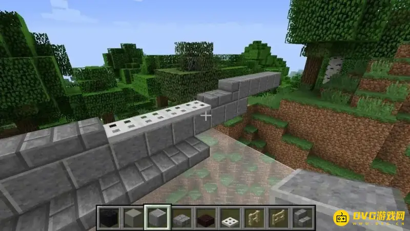 2、在安山岩两侧前后延展石砖楼梯对齐,然后从最前面一格开始,往外放五格灰色混凝土。