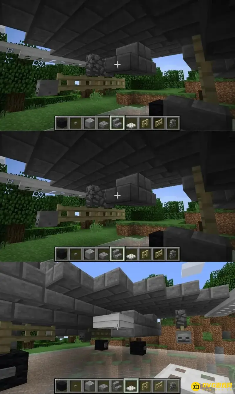 15、机身侧面最前面的空缺补一块石砖台阶,空出两格再补台阶到机翼尾部,两格先放一个栅栏,然后前面再接上一根栅栏,后面补上栅栏门。