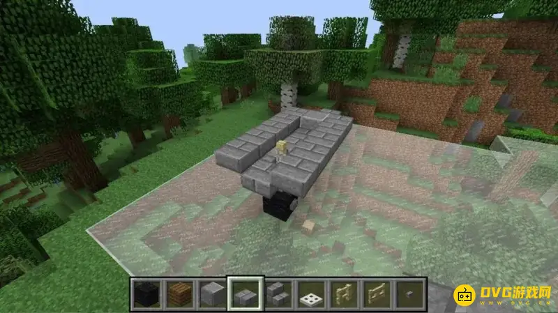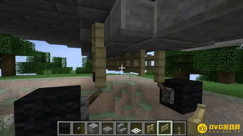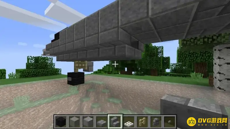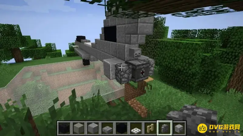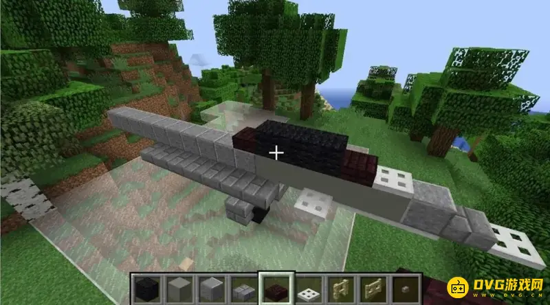 可以用黑色羊毛、石砖台阶、栅栏、灰色混凝土、磨制安山岩等材料建造战斗机