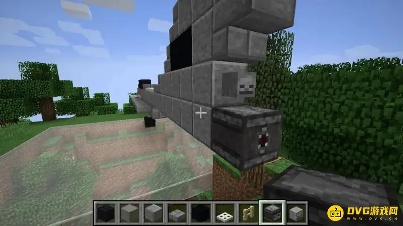 9、下面一层补安山岩到平齐,上下两格放置骷髅头模型和侦测器,两侧补出两块安山岩放置原石墙。