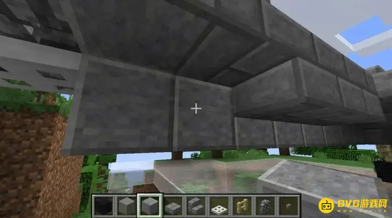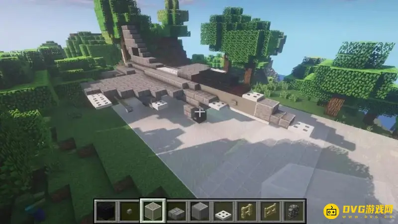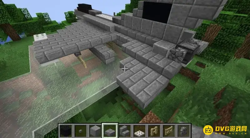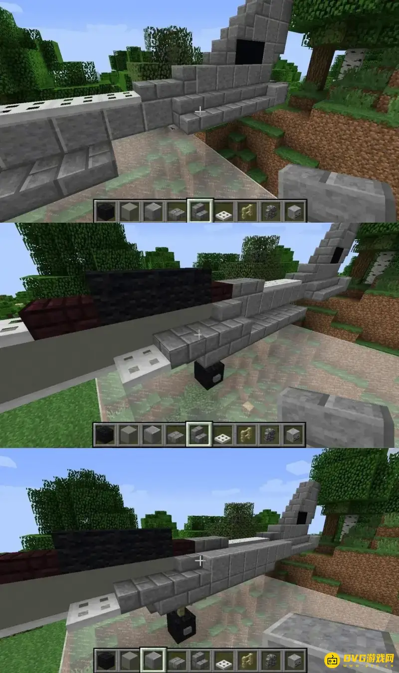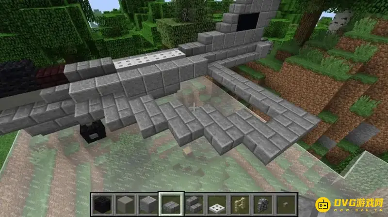 12、从侧面第一块安山岩开始放置石砖台阶,一路折线直到与最后一块安山岩对齐!然后从安山岩后面延伸一条石砖台阶在机翼尾部接上就好。
