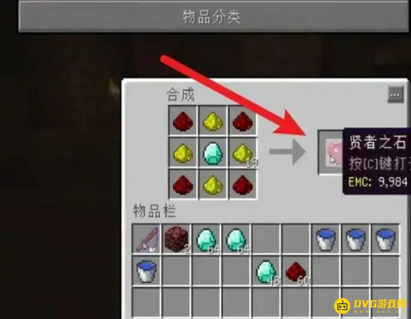 将四个萤石粉、四个红石粉和一个钻石,以下图的方式摆放,合成【贤者之石】: