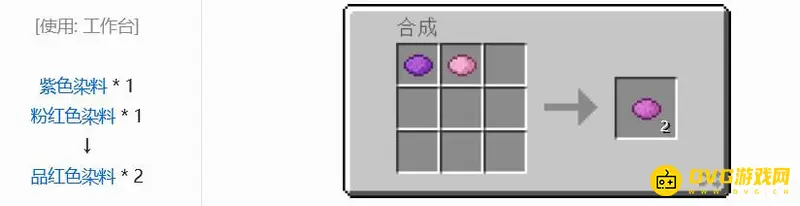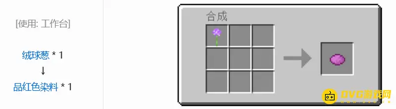 1.在物品栏或工作台中,1个绒球葱可以得到一个品红色染料,1个欧丁香可以得到2个品红色染料。