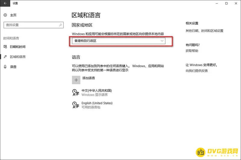 2.在接下来的过程中需要的是将“区域和语言”设置中的“国家和地区”更改为别的地区。