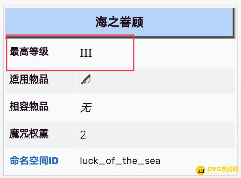 最高三级。海之眷顾(Luck of the Sea)是用于钓鱼竿的魔咒,能使玩家在钓鱼时更加幸运。基于默认的战利品表,每级此魔咒都会将钓上宝藏的概率提升约2%,同时相应地降低钓上鱼和垃圾的概率。