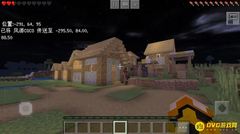 3.小伙伴们可以一路跑过去,也可以用/tp x y z指令瞬间传送到村庄门口,y坐标是村庄的坐标高度,一般输入70~80左右就行。