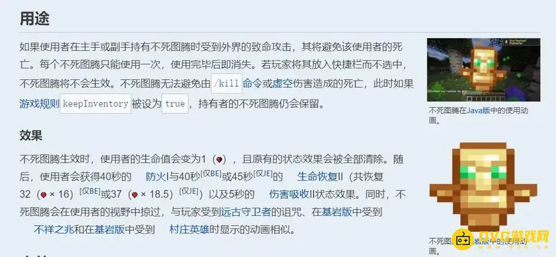 在我的世界游戏中不死图腾是能在濒死状态下拯救玩家的物品,玩家在主手或副手持有不死图腾时受到外界的致命攻击,此物品能够阻止玩家的死亡。