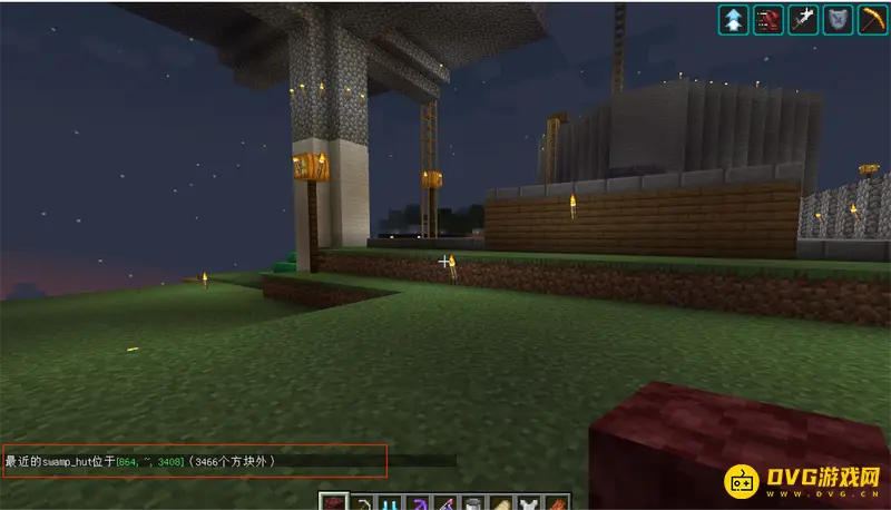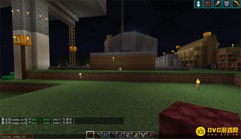 1、按T键打开对话框,输入指令“/locate swamp_hut”(需要开启作弊)。