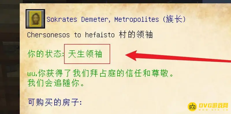 4、玩家需要在村落中建立声望,使自己的状态达到天生领袖;