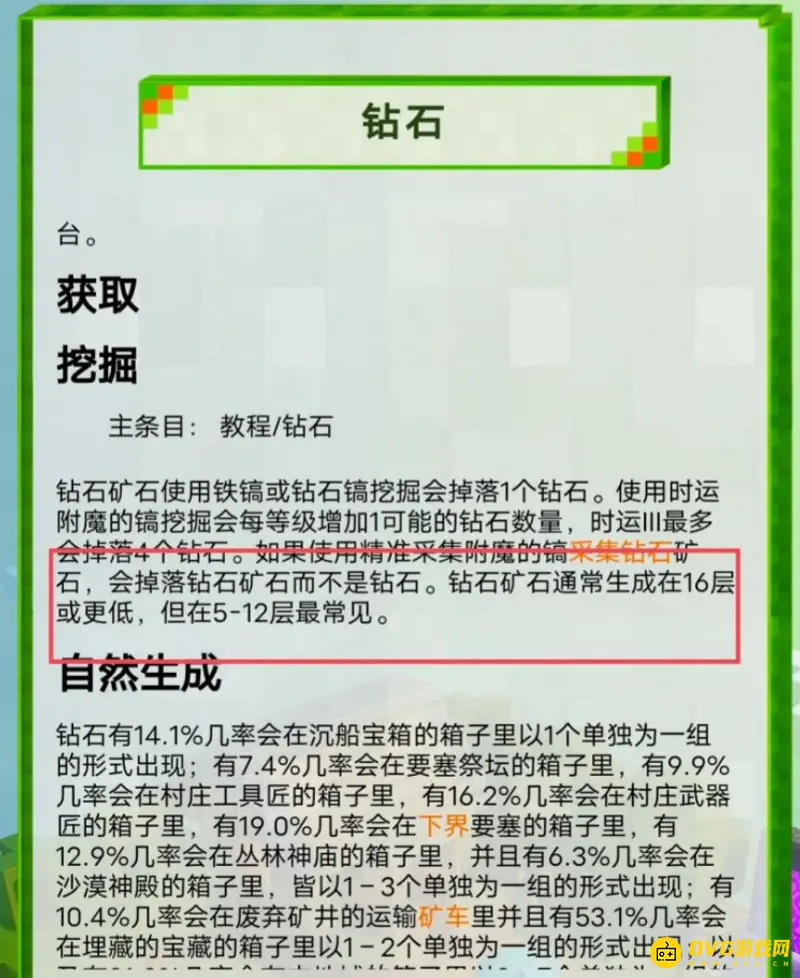 钻石矿石通常生成在16层或更低,但在5-12层最常见。钻石可以制作耐久的装备;挖取钻石可以在地表打洞,然后准备好自己的镐子用于持久的在地下挖取;挖取钻石应该做好人物的准备比如准备好火把以便获取视野,并带好食物防止人物死亡装备遗失。