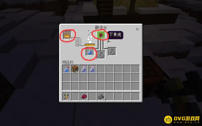 1,首先我们进入酿造台,如图依次放置烈焰粉,地狱疣和水瓶。