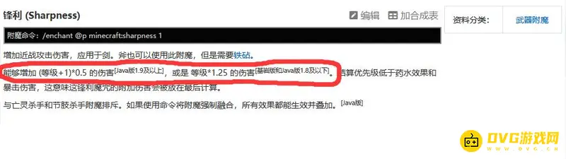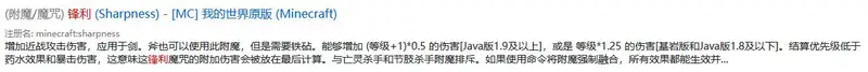 3,接着就会发现能够增加 (等级 1)*0.5 的伤害[Java版1.9及以上],或是 等级*1.25 的伤害[基岩版和Java版1.8及以下],所以基岩版和Java版1.8及以下锋利5加6.25攻击力,Java版1.9及以上可以增加3攻击力。
