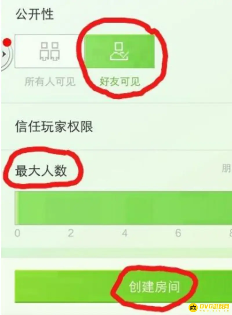 4、接着在下面把公开性设置成好友可见,然后设置人数,点击创建房间。