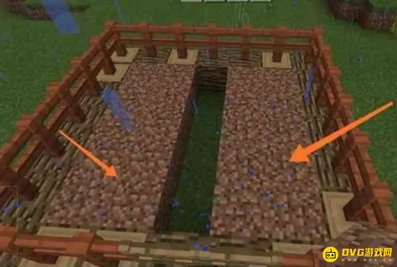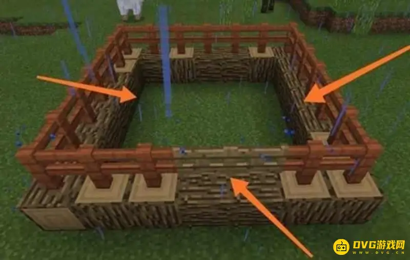 2.搭建好空格之后,在空格的上面,搭建上一层栅栏,这样就有两格高了,防止羊群进入