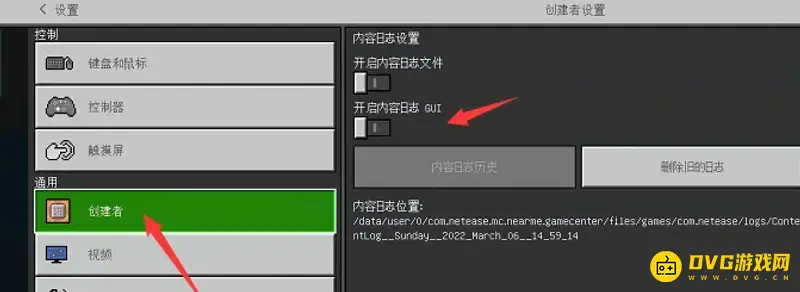 3、最后进入设置界面后,点击左侧创建者,然后点击右侧开启内容日志即可查看内容日志文件。