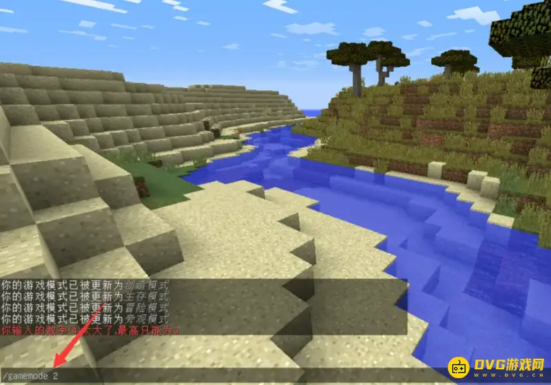 5,不仅仅如此,我们也可以切换为极限模式(也叫冒险模式),输入的方法步骤一样,代码是/gamemode 2,旁观模式是/gamemode
