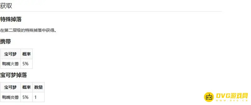 获得方法为在第二层级的特殊掉落中获得,具体掉落的宝可梦为鸭嘴火兽,概率为5%。