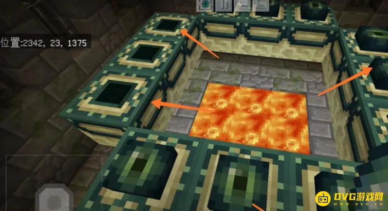 6、走上阶梯可以发现末地遗迹传送门就在这儿,然后我们拿出末影之眼在12个末地传送门的上面放上末影之眼,末地遗迹传送门即被激活。