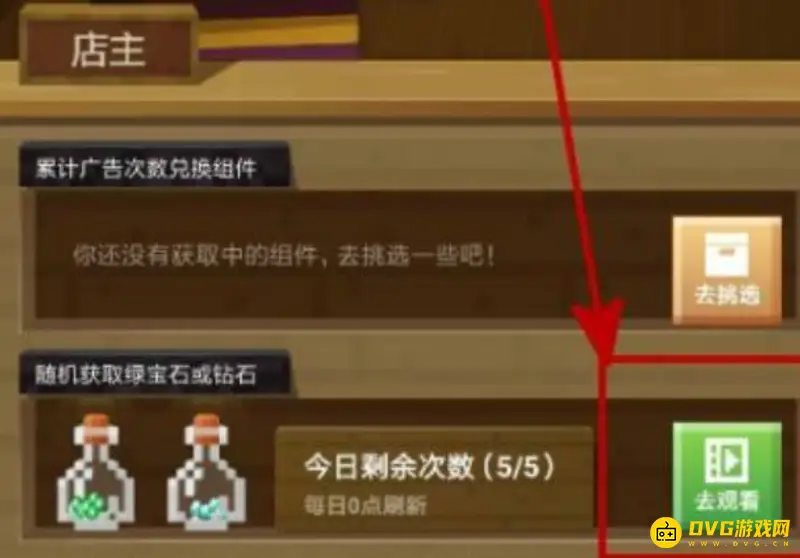 2、在店主的馈赠里面可以看到下方有一个去观看选项,这里便是店主的馈赠了,看完一个视频可以获取随机的绿宝石或钻石