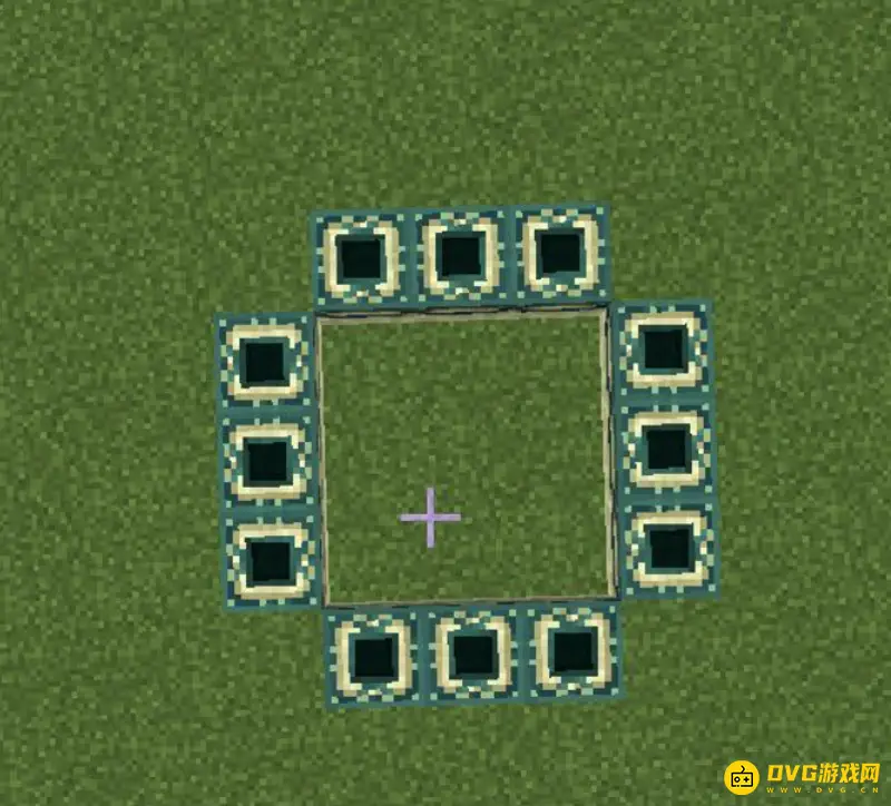 3、然后我们站在方块上,向正前方面对的三个方块放置末地传送门,然后转向再正对着放三个。