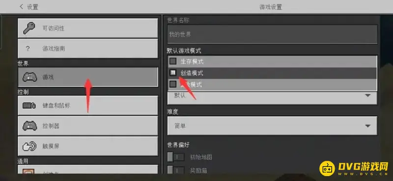 2、然后点击左侧游戏,将游戏模式设为“创造模式”。