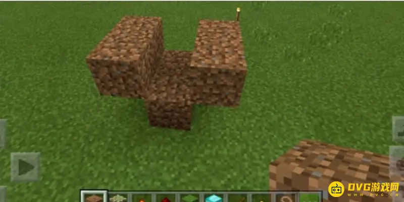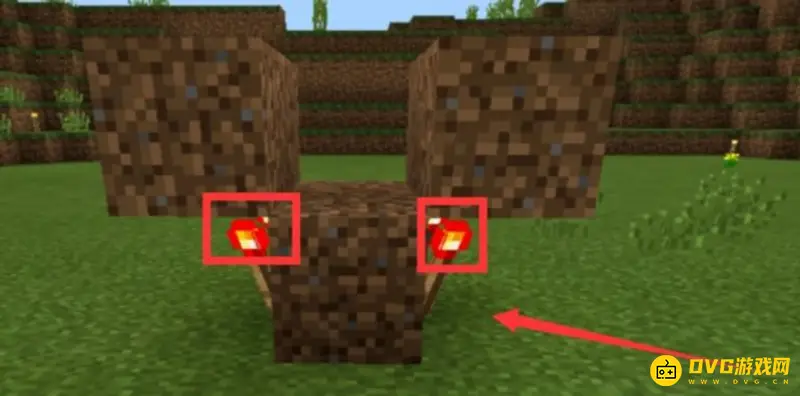 6、在下层泥土的两侧分别插上两个红石火把。