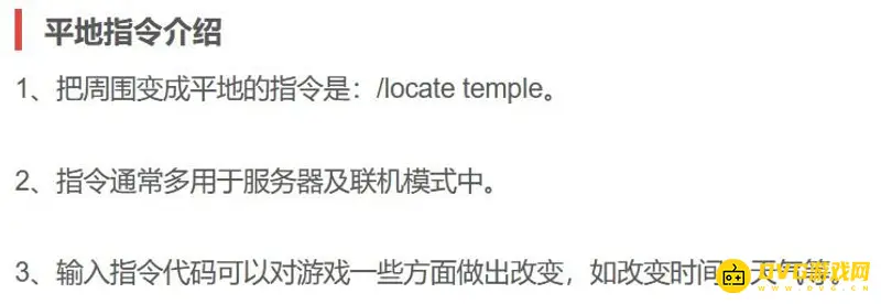 把周围变成平地的指令是:/locate temple。指令通常多用于服务器及联机模式中,输入指令代码可以对游戏一些方面做出改变,如改变时间、天气等。可以用指令召唤出命令方块做一些有意思的东西,多用于地图制作上,前提需开启作弊模式。