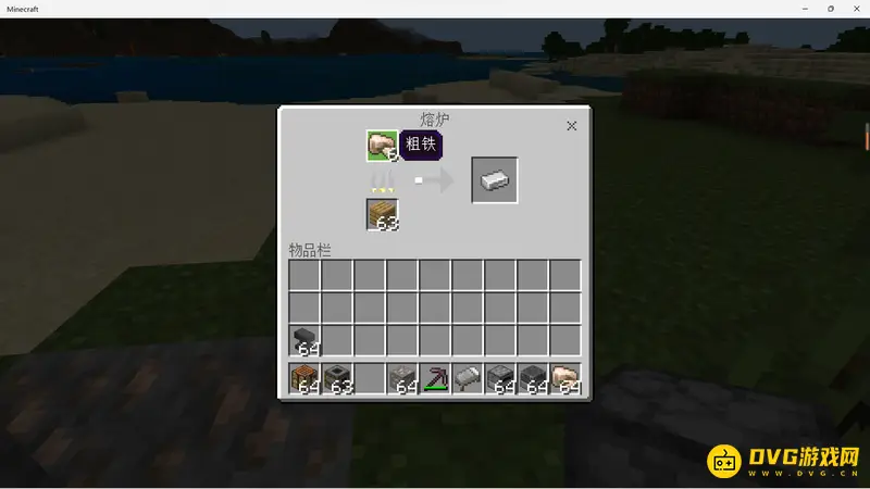 3:放置熔炉,将木材放入下层框内,作为燃料,上层放入粗铁,会得到铁锭
