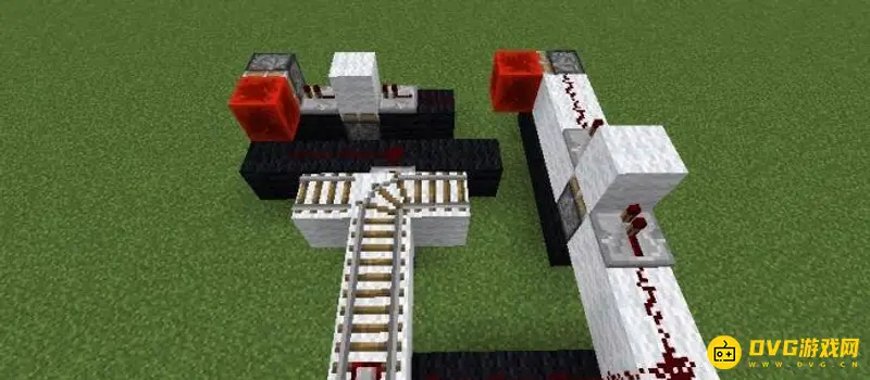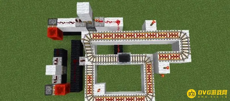 3、第三步:铺设铁轨,在下面连接红石电路的地方铺设探测铁轨,在交叉处铺设普通铁轨,其他地方可以根据实际情况自行选择铺设充能铁轨或者普通铁轨。