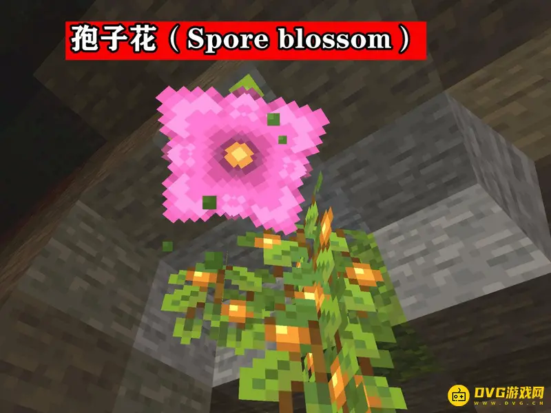 孢子花是用孢子粒子来繁殖的,孢子花垂落于洞穴顶端。这是一朵巨大的正方形粉色大花,绝对是目前mc最美的一朵花。因为它会滴落并在周围的空气中产生新的绿色的“孢子”粒子。