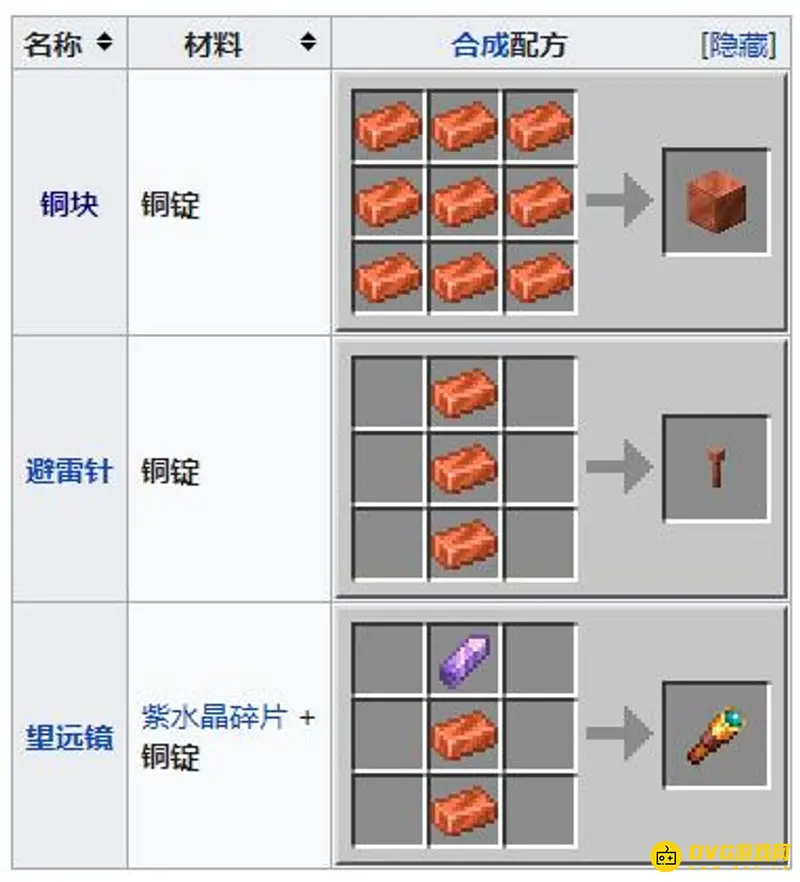 铜锭可以用来合成避雷针、望远镜和铜块。而铜块也可以进一步加工变成楼梯和台阶。