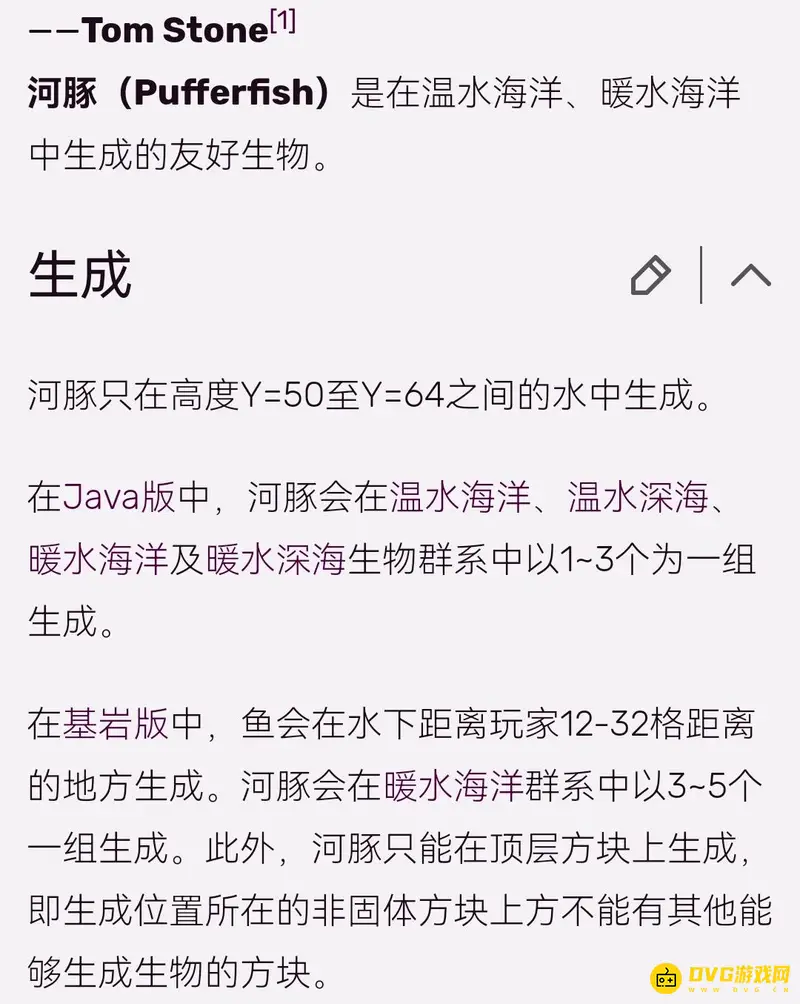 河豚只在高度Y=50至Y=64之间的水中生成。在Java版中,河豚会在温水海洋、温水深海、暖水海洋及暖水深海生物群系中以1~3个为一组生成在基岩版中,鱼会在水下距离玩家12-32格距离的地方生成。河豚会在暖水海洋群系中以3~5个一组生成。此外,河豚只能在顶层方块上生成,即生成位置所在的非固体方块上方不能有其他能够生成生物的方块。