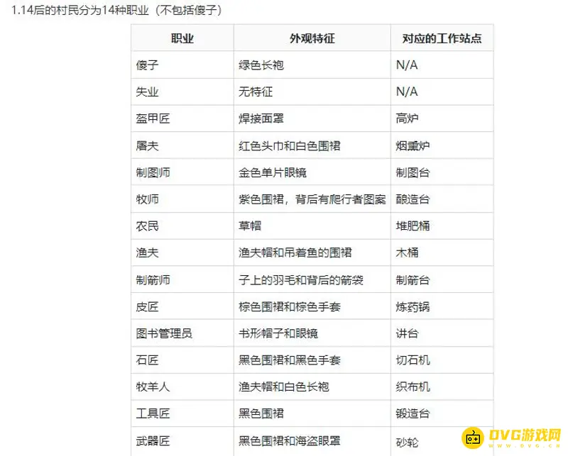村民种类在1.14以前有15种,在1.14以后只有14种了,少了一种傻子职业。