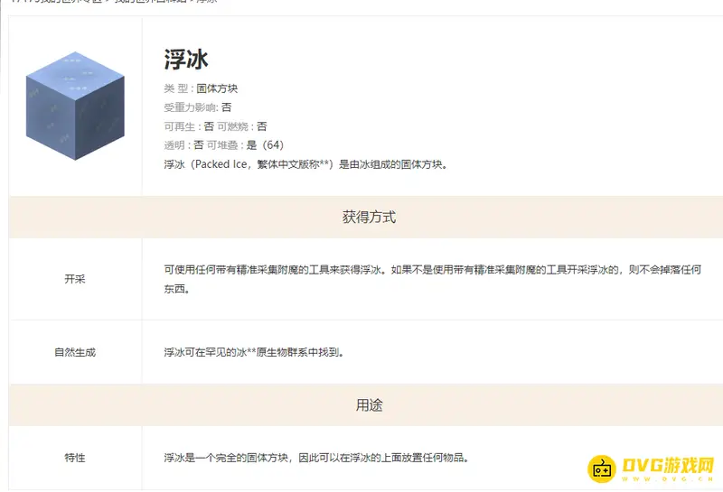 在我的世界游戏中,浮冰是一个完全的固体方块,因此可以在浮冰的上面放置任何物品,不像普通的冰,浮冰永远不会融化,玩家可以通过开采或自然生成来获得。