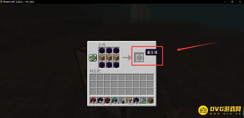 1.首先,我们可以在工作台的界面中使用六个哭泣的黑曜石以及三个萤石摆放,合成一个重生锚。