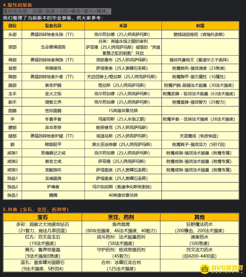 属性优先级,法强,急速,5回,爆击,智力,精神。智力提供法力上限,还可以提供法术强度和法术爆击,急速可以降低GCD以及施法时间。随着装备的逐步提高,成为除智力外优先的属性。