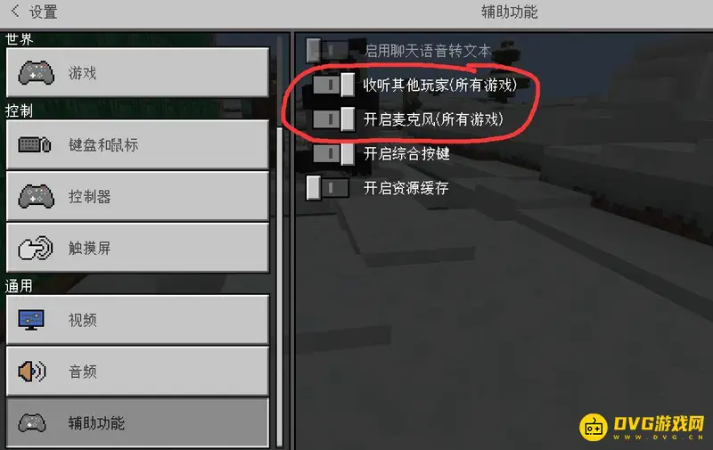 2,然后往下滑动找到辅助功能,在右侧开启麦克风和收听其他玩家即可。