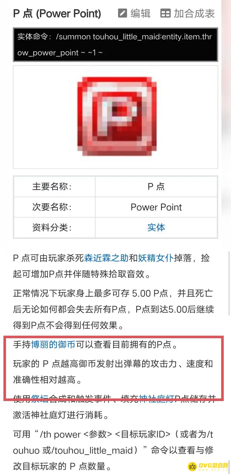玩家的 P 点越高御币发射出弹幕的攻击力、速度和准确性相对越高,作用很大。P 点可由玩家杀死森近霖之助和妖精女仆掉落,捡起可增加P点并伴随特殊拾取音效。