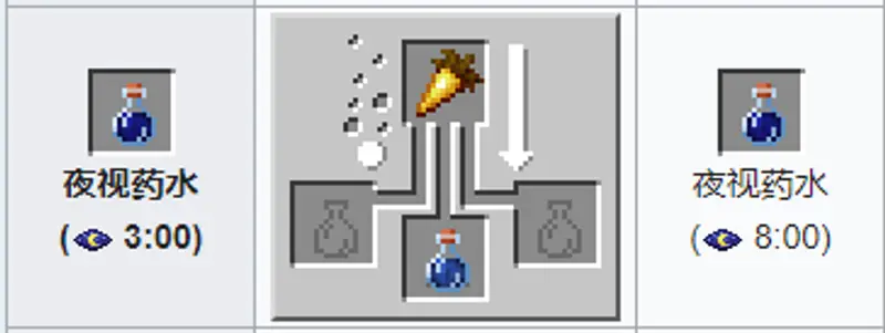 材料:金胡萝卜 粗制药水。药水效果:能够在炼狱,或是天黑的时候应用,认清身旁的物件。使一切以最大亮度显示,包括水下区域。
