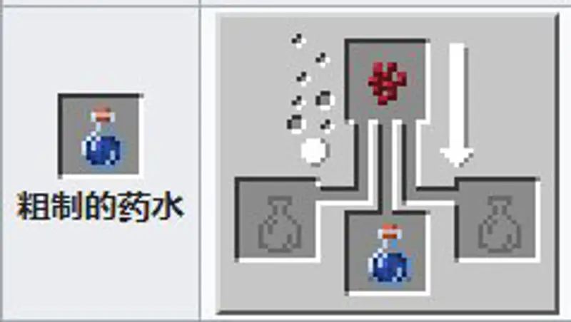 材料:粗制药水 烈焰粉。药水效果:提高角色伤害能力一个半心的伤害,添加萤石粉,效果翻倍。