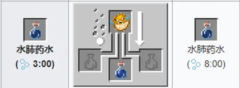 材料:河豚 粗制药水。药水效果:服用后会给与玩家15秒挨饿III减少挨饿度3点、15秒反胃与一分钟中毒IV的效果。这会使玩家生命值强制保持在半红心长达48秒,和平模式下为三十秒。没法应用莹石。在水下时氧气条不会耗尽。